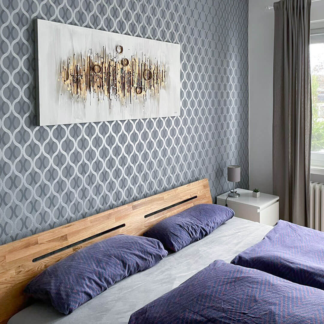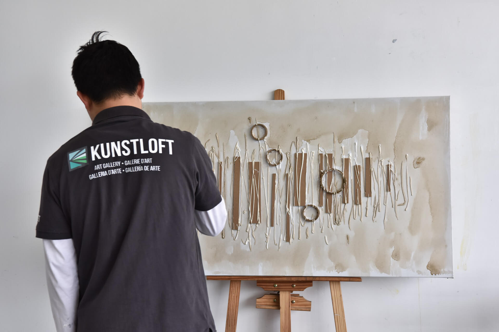 Die Braun- sowie Goldnuancen wirken mit anziehender Raumtiefe auf dem handgemalten Ölgemälde 'Glittering Crowd' und durchbrechen das Grau im Zentrum. Umrahmt von der zurückhaltenden Farbe und unterlegt mit Holz- und Kunststoffelementen reizt die Pracht des Spektakels im abstrakten Stil die Kunden Ihrer Kanzlei besonders und offenbart Ihren exzellenten Kunstgeschmack. Ihr handgemaltes Gemälde erhalten Sie in der Größe 120x60cm. Anders als bei minderwertigen Drucken auf Leinwand können Sie auf unseren Unikaten jeden Pinselstrich fühlen. 0 Oil painting 1 Ölgemälde Handmade Quality 2 2