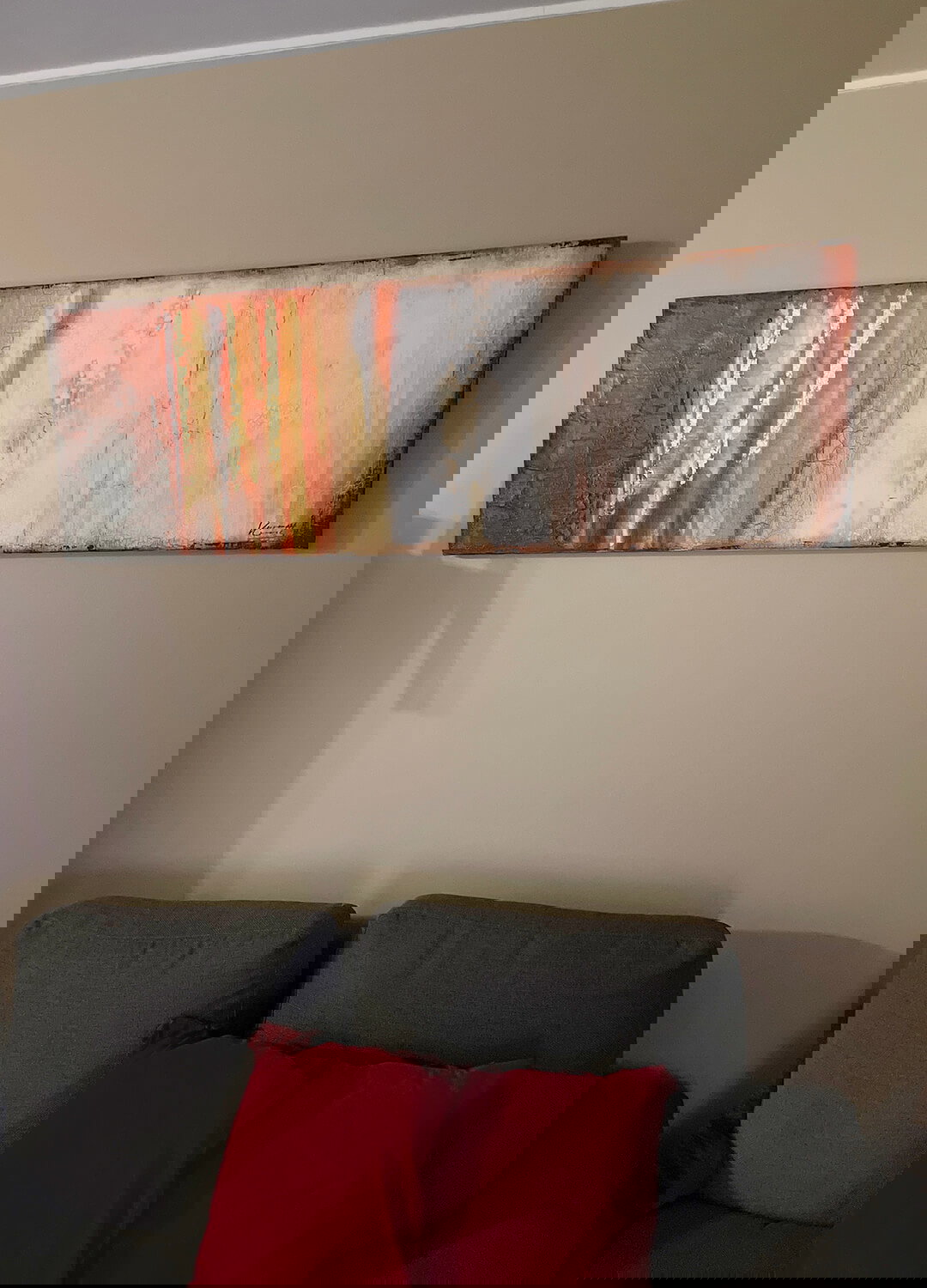 Im abstrakten Bild 'Vagile Virtuosität' akzentuiert kräftiges Rot sanfte Ockertöne, die über die Leinwand zu fließen scheinen. Die weichen Linien stehen im Kontrast zu scharfkantigen roten Flächen und schaffen so ein aufsehenerregendes Kunstwerk. Schmücken Sie mit diesem handgemalten, mit Goldglanz verzierten Acrylgemälde stilvoll Ihr Wohnzimmer. Ihr handgemaltes Gemälde erhalten Sie in der Größe 150x50cm. Anders als bei minderwertigen Drucken auf Leinwand können Sie auf unseren Unikaten jeden Pinselstrich fühlen. 0 Canvas pictures 1 Acrylgemälde Handmade Quality 2 2 0