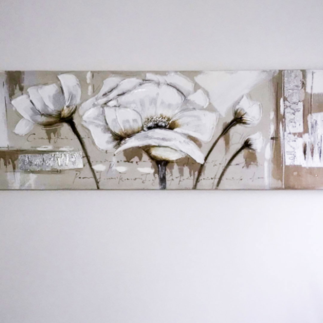 Die 'Verblasste Erinnerung' auf Ihrem handgemalten Ölgemälde sorgt dafür, dass Erinnerungen niemals ganz vergehen. Mit eleganten Silberstreifen hat der Künstler sein Werk perfektioniert. Hängen Sie dieses wunderschöne Motiv der weißen Blüten auf unbehandeltem Leinenstoff in Ihr Wohnzimmer und beginnen Sie, Ihre Zeit bewusster zu erleben und Momente zu bewahren! Ihr handgemaltes Gemälde erhalten Sie in der Größe 150x50cm. Anders als bei minderwertigen Drucken auf Leinwand können Sie auf unseren Unikaten jeden Pinselstrich fühlen. 0 Oil painting 1 Ölgemälde Handmade Quality 2 2 0