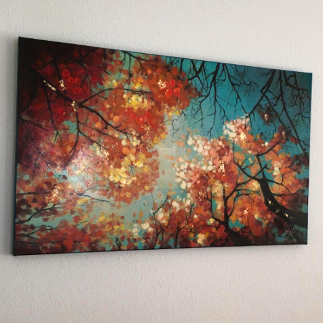 Tablou foarte frumos, încălzește camera și aduce un calm plăcut. Tabloul evocă sentimente autumnale și puteți auzi, de asemenea, vântul blând care suflă printre copaci. Tonurile albastre complementare sunt frumos îmbinate și se potrivesc perfect cu tonurile de culoare mai degrabă calde. Ne plac foarte mult tușele și cantitatea de culoare, iar frunzele copacilor care ies în evidență pe alocuri adaugă un efect pop plăcut. O imagine foarte armonioasă!