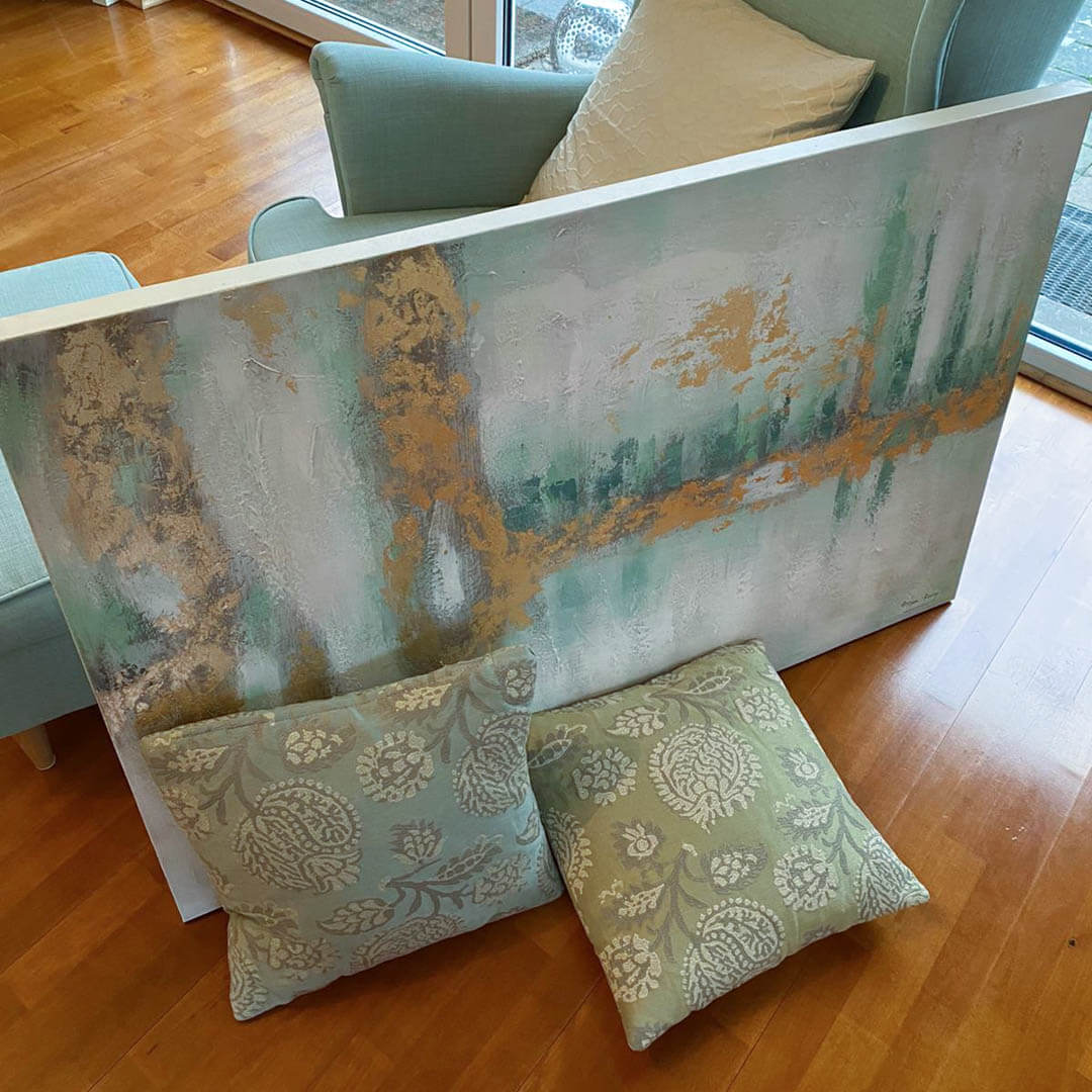 Begeben Sie sich in Ihrer Vorstellung auf einen Spaziergang am Fluss entlang und spüren Sie die energetisierende Luft, die Sie umgibt. 'Riverside Stroll' manifestiert dieses Gefühl mit den Farben Türkis und Beige und veredelt das abstrakte Holzbild mit handgemaltem Goldglanz. Die plastische Textur des Kunstwerks trägt zur hochwertigen Qualität bei. Ihr handgemaltes Gemälde erhalten Sie in der Größe 120x80cm. Anders als bei minderwertigen Drucken auf Leinwand können Sie auf unseren Unikaten jeden Pinselstrich fühlen. 0 Oil painting 1 Ölgemälde Handmade Quality 2 2