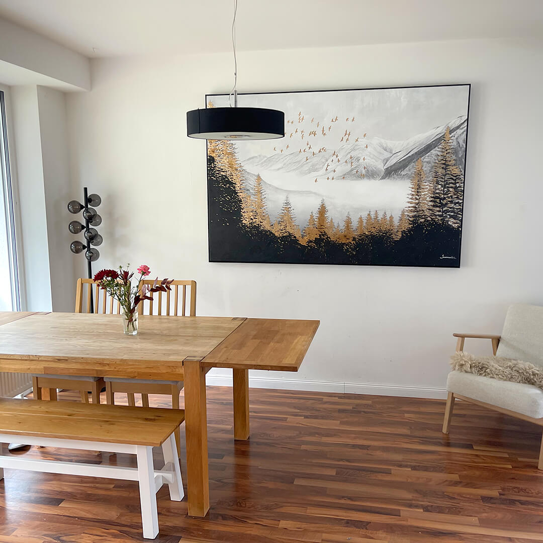 Artista Summer Xia reușește să întruchipeze simplitatea unui sentiment de libertate în această pictură în ulei de mari dimensiuni. Păsările pictate manual cu luciu auriu zboară peste 'Snowy Mountains' în gri de impasto la apus și pot fi admirate din copaci cu o energie unică.